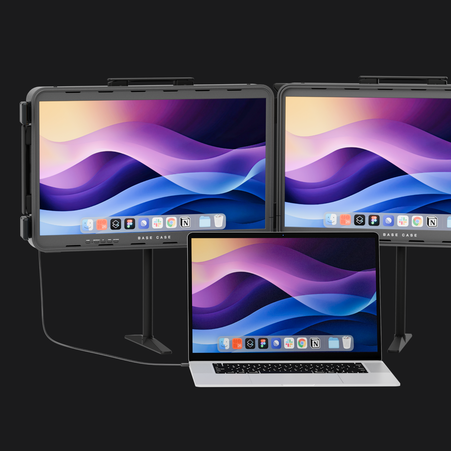 Base Case deploys into a full workstation within seconds, offering dual 24” UHD/4K screens that allow for maximum productivity on the go.