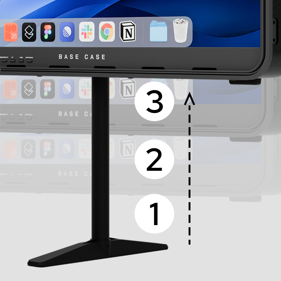 Base Case’s integrated telescoping legs transform the case from a carry-on case to a proper workstation in seconds. Built directly into the case, the legs deploy easily and lock securely into three separate height settings.